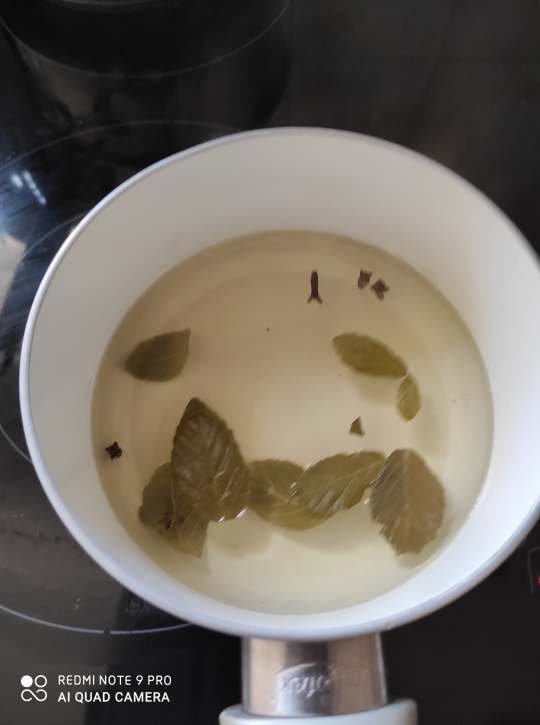 Ma bouteille contient 250ml, alors je prends 5 clous de girofle. Après plusieurs essayes j’ai conclu que cette quantité est parfaite. Ne prenez pas une bouteille bien plus grande car il vaut mieux en faire du frais plus souvent. J’ai également essayé la recette en infusion et en décoction. Et la meilleur solution est la décoction car ainsi on extrait mieux les bienfaits du clou de girofle. Mais à vous de voir ce qui vous convient le mieux. Je laisse donc bouillir quelques minutes l’eau avec les clous de girofle et puis je couvre la casserole et la laisse de côté pour deux heures.