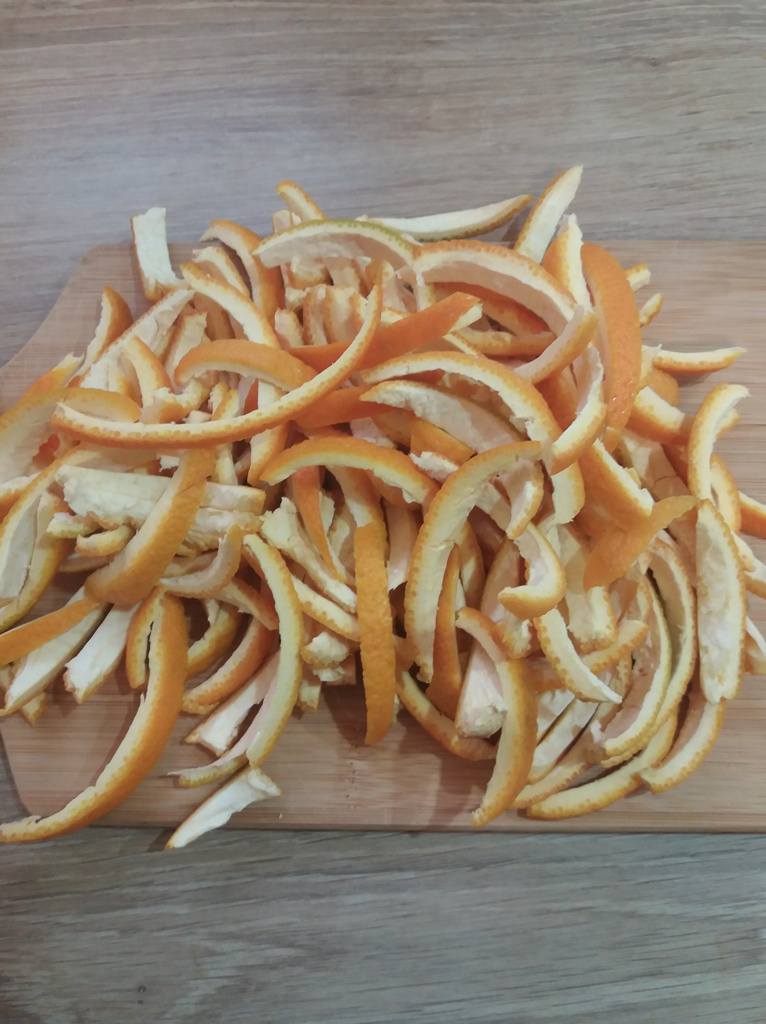 Prenez des écorces d’oranges et coupez-les en lamelles. Pour cette recette, je garde la partie blanche car lorsqu’elle va cuire elle va ramollir et donner du goût. A titre d’information, on peut garder nos épluchures quelques jours au frigidaire dans une boite hermétique.
