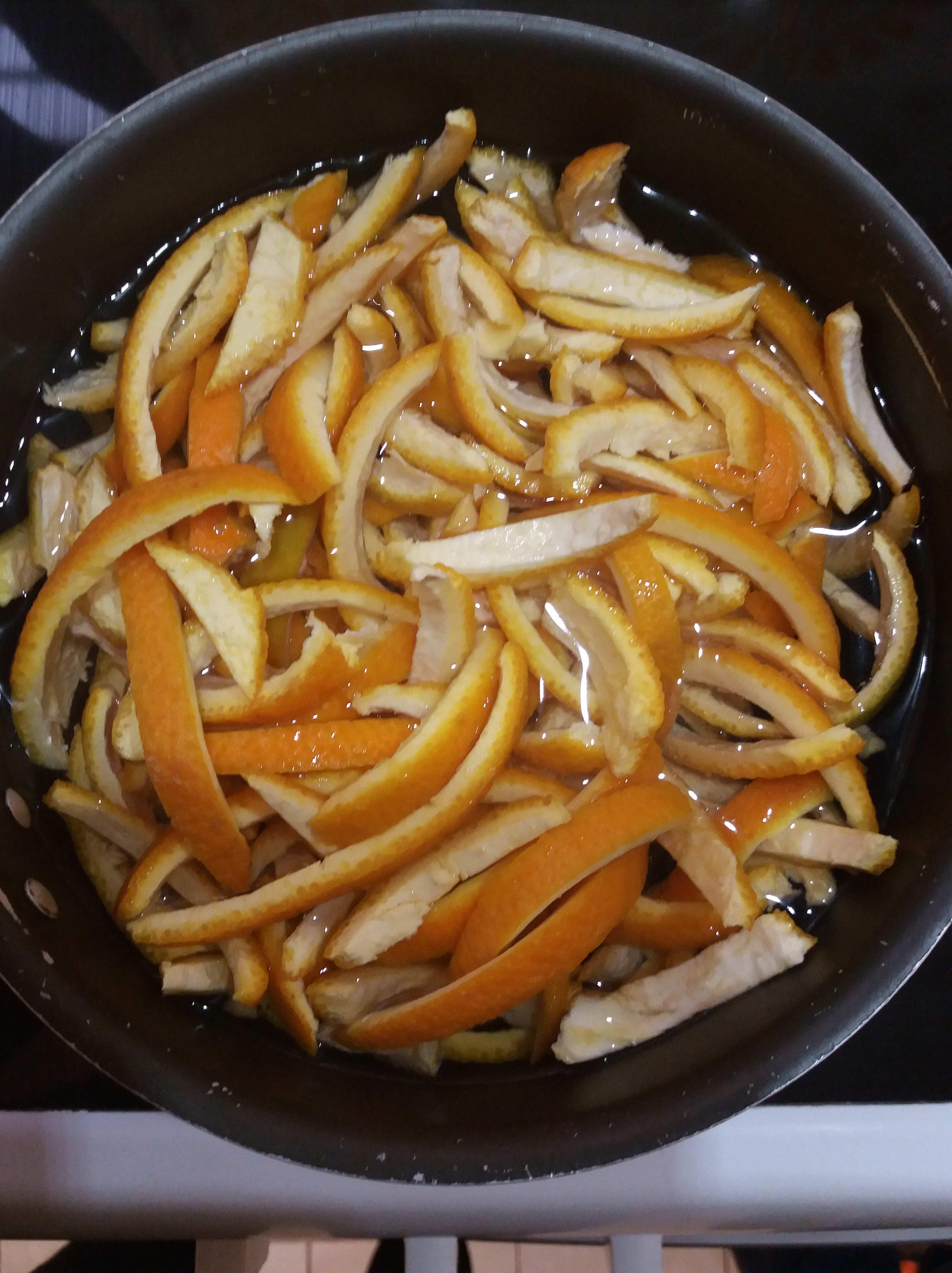 Puis vous pesez vos écorces et vous mettez la même quantité de sucre et la même quantité d’eau dans une casserole et vous laissez cuire à feux doux comme de la confiture. Certains conseillent de ne pas amener la cuisson jusqu’à caramélisation. Mais personnellement, je préfère lorsque les écorces sont caramélisées.