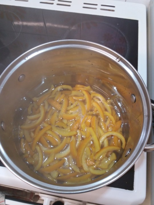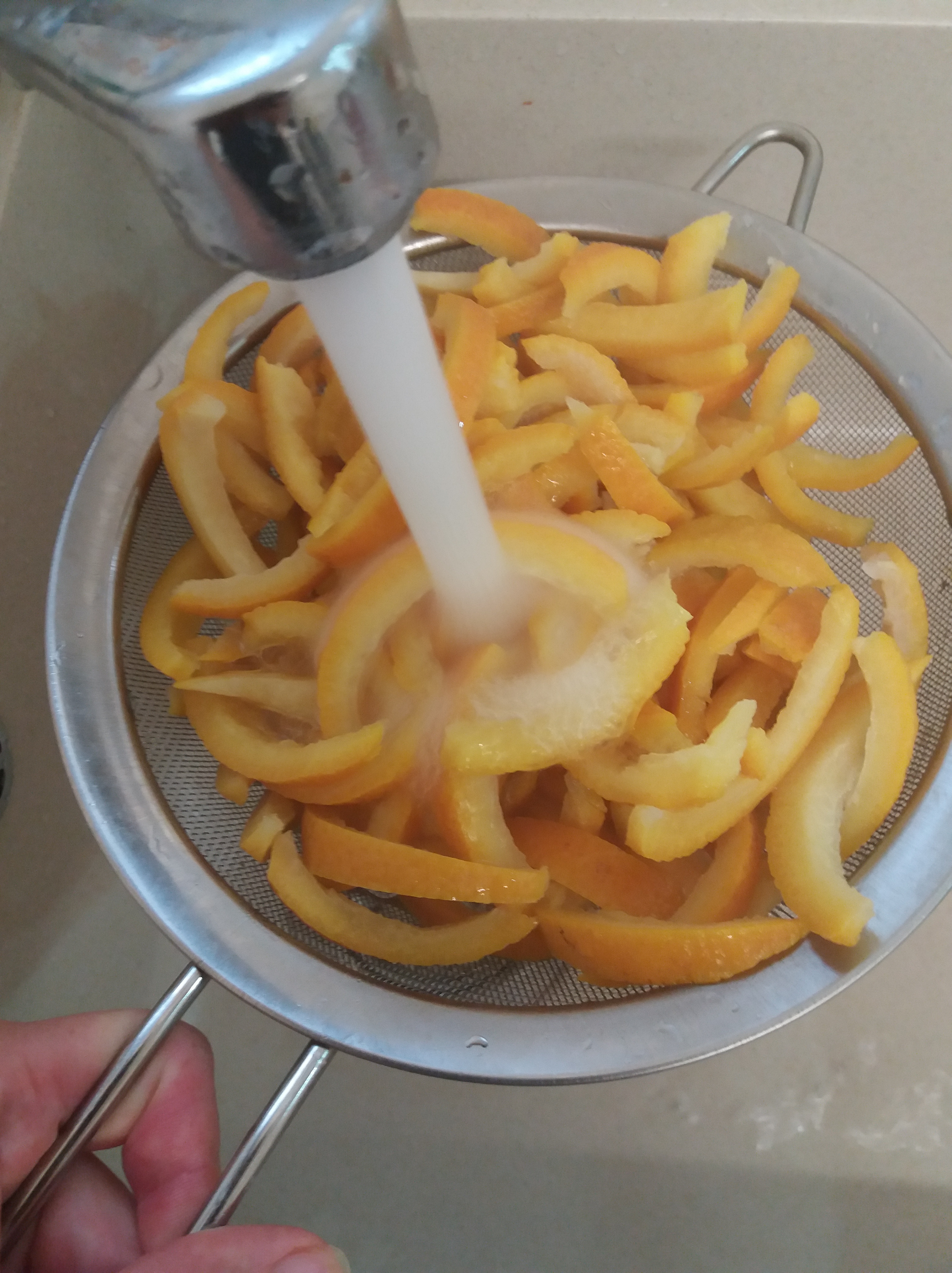 Ensuite, il vous faut les blanchir trois fois. En d’autres mots, vous plongez vos écorces dans l’eau bouillante quelques minutes, et puis vous les versez dans une passoire et les rincez à l’eau froide. Ceci 3 fois.