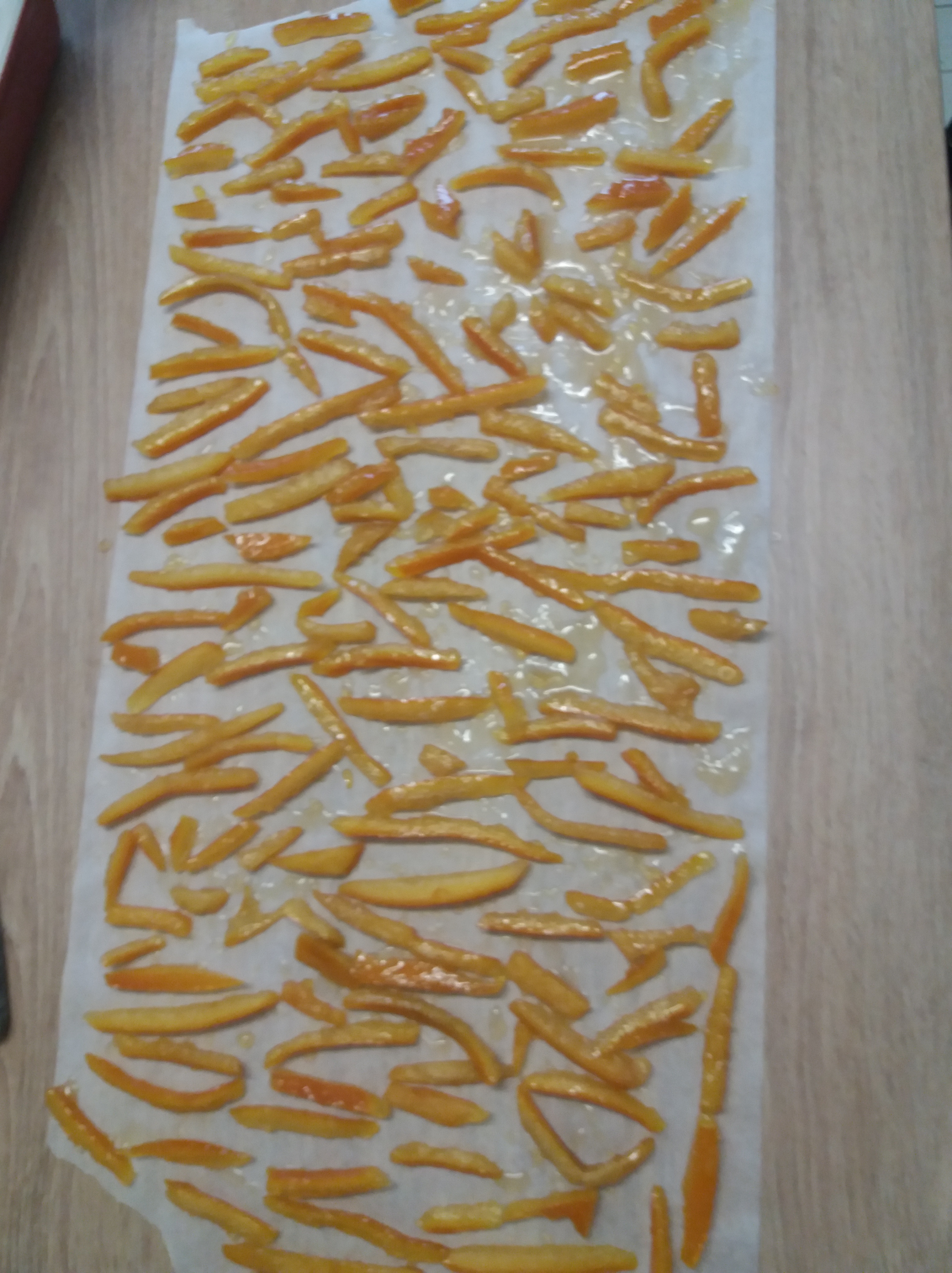 La cuisson dure environ 30 min, après quoi, on étale les écorces sur une feuille de papier sulfurisé pour les laisser refroidir et durcir, environ une à deux heures. Ce n’est pas grave si vous les laissez plus longtemps.