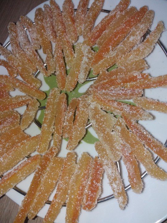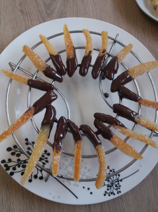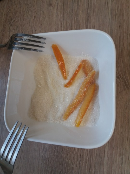 Puis à à l’aide de deux fourchettes, roulez vos écorces dans du sucre et posez les sur une grille en métal (ou un sous-plat comme pour moi :D ) et laissez encore vos écorces une petite heure à l’air afin qu’elles durcissent encore un peu.